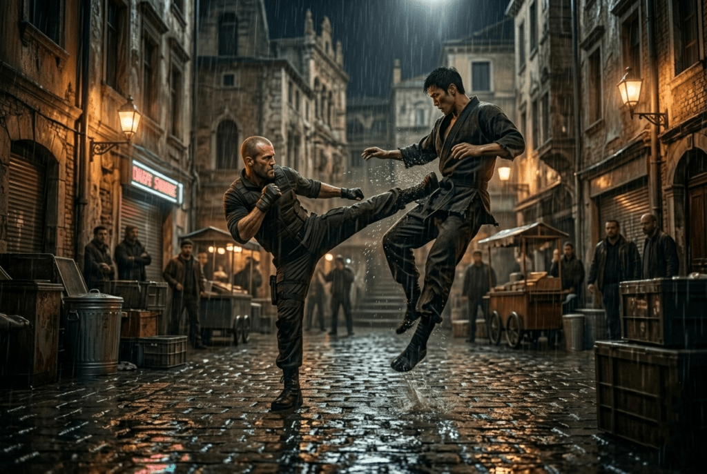 In a rain-soaked alley, two rival masters confront a bitter blood feud with high-stakes, brutal martial arts. Each bone-crushing strike reverberates across the cobblestones as they battle for honor and survival in the city’s relentless underworld. As the silent crowd watches, every move carries deadly consequence, and by the end of this explosive midnight clash, only one will emerge alive